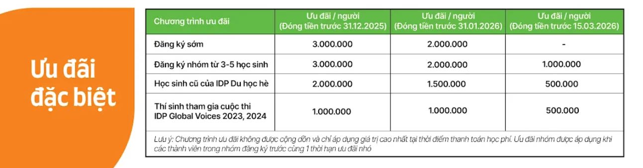 Tham gia chương trình du học hè năm nay, học sinh có cơ hội nhận ngay nhiều ưu đãi đặc biệt từ IDP. Ưu tiên dành cho phụ huynh đăng ký sớm, các học sinh từng tham gia du học hè cùng IDP, và những thí sinh tham gia cuộc thi Global Voice 2023 & 2024 cũng nhận được chính sách ưu tiên khi đăng ký chương trình. Cụ thể như bên dưới.
